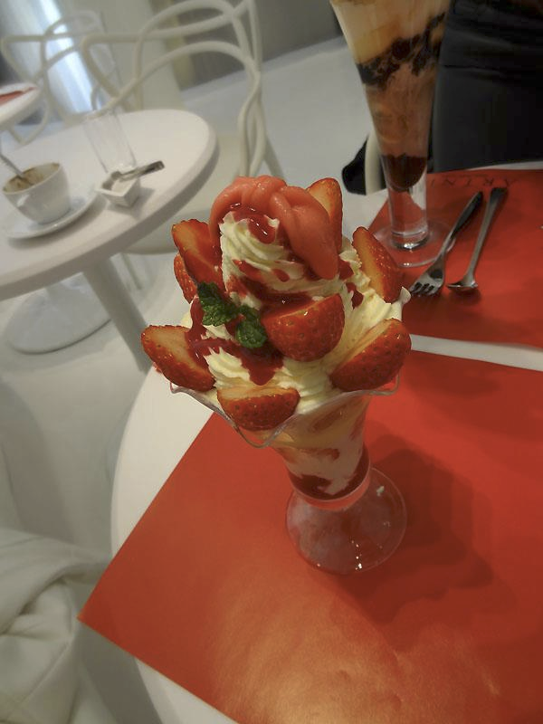 A parfait loaded with fresh strawberries, vanilla ice cream, and Panna cotta. A dainty ribbon reminiscent of Aerith tops this dessert.