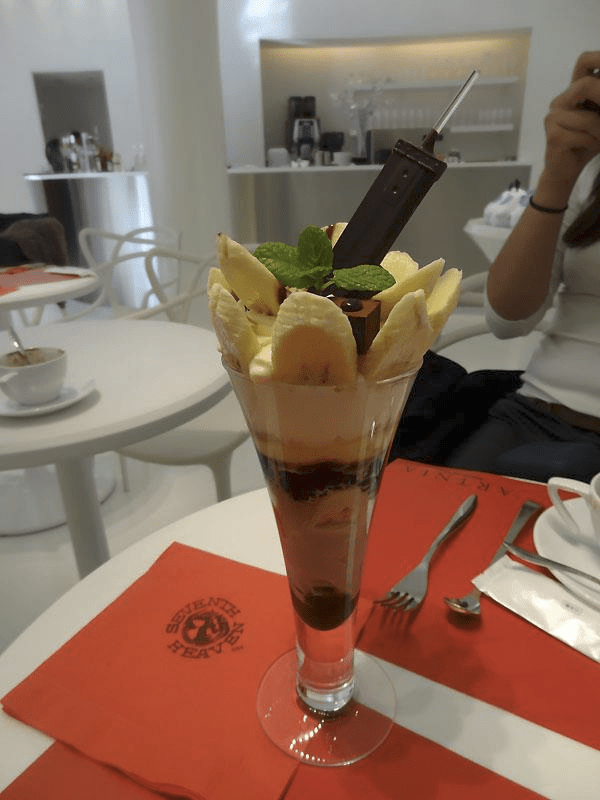 Chocolate panna cotta, with coffee jelly and vanilla ice cream. To finish this dessert creation, it has been topped with a layer of whipped cream, bananas, chocolate sauce, and a chocolate miniature replica of Cloud’s Buster Sword.