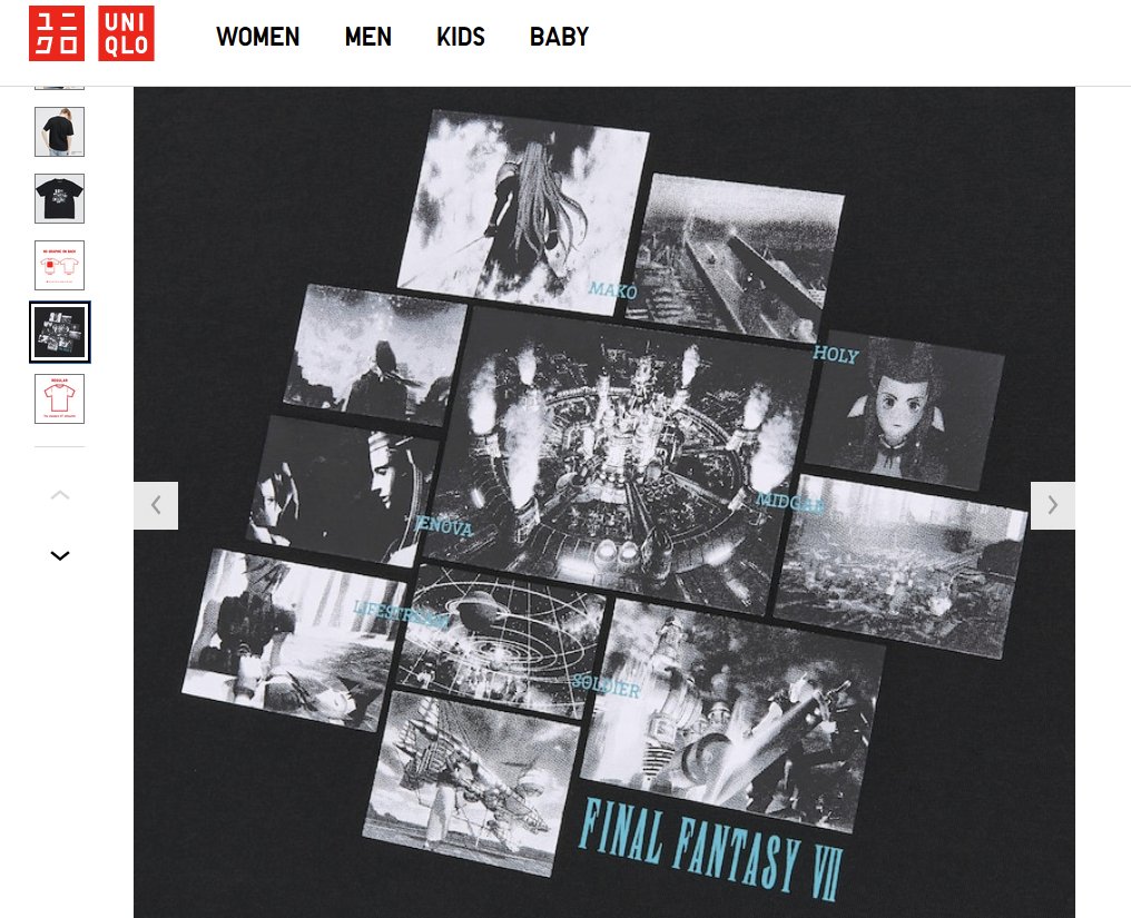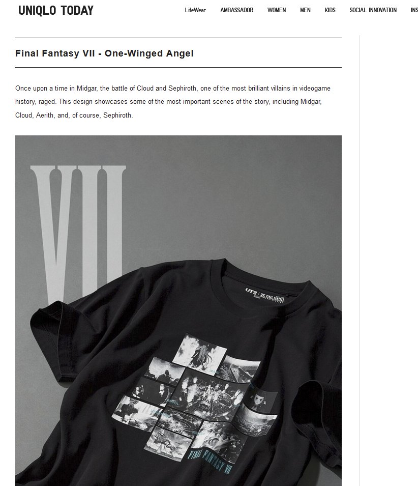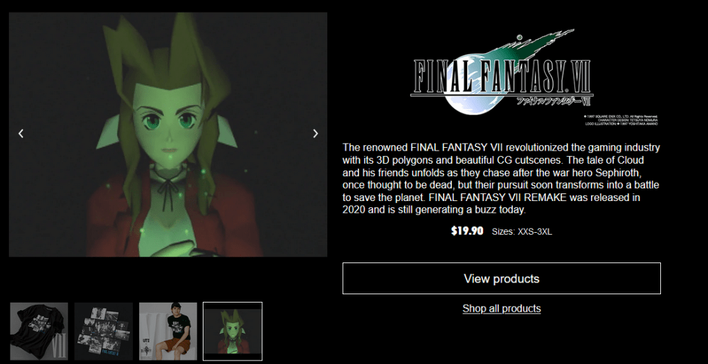 Right off the bat, the description calls out Final Fantasy VII’s holy trinity: Cloud, Aeris, and Sephiroth. Pretty neat! But that’s not all. Uniqlo’s UT webpage describing the page has a different description. It doesn’t name drop our girl Aeris.. but it features an in-game image of her alongside the T-shirt photos.