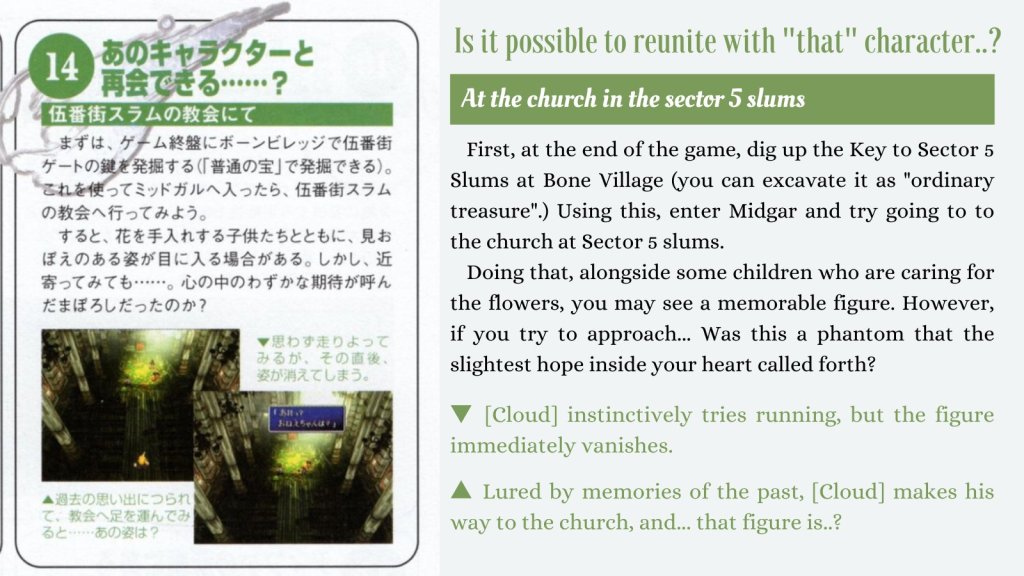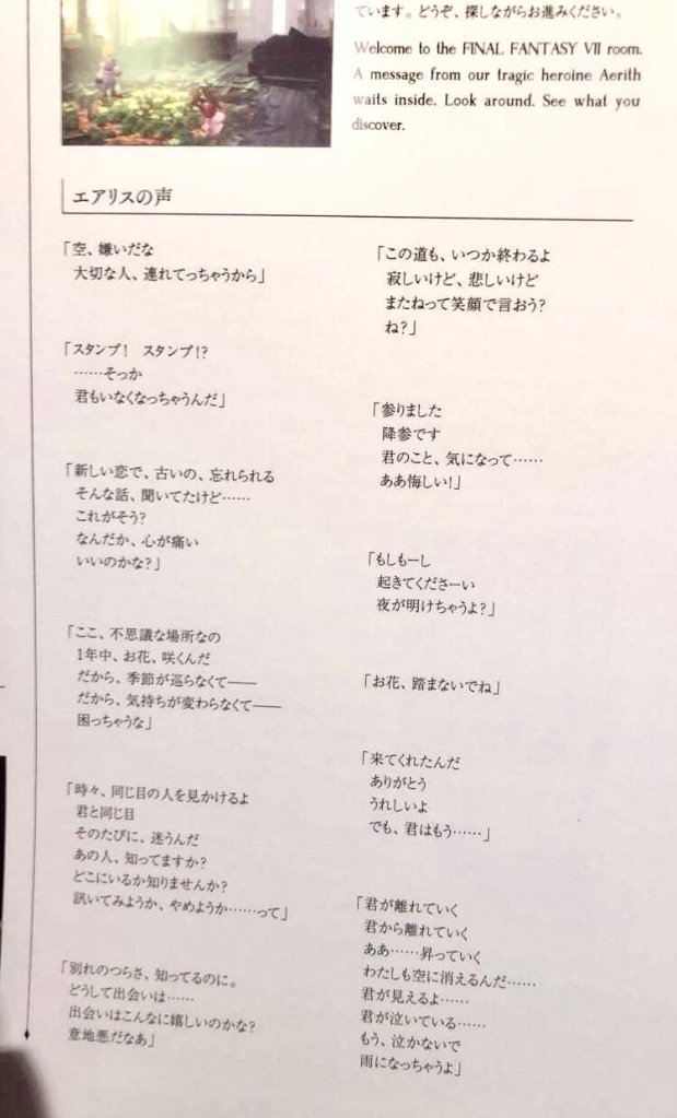 In the myriad of official books, manuals, pamphlets, descriptions, and signage, we see time and time again Cloud’s relationship with Aeris being described using the word “heart” (心). From Aeris thawing Cloud’s heart to his heartfelt grief at her loss, here’s a digital exhibit of the Clerith relationship.