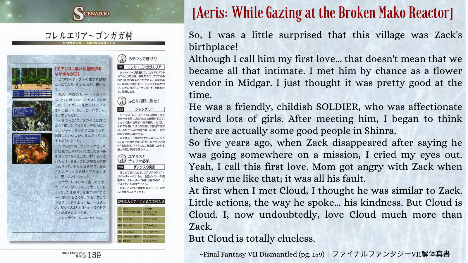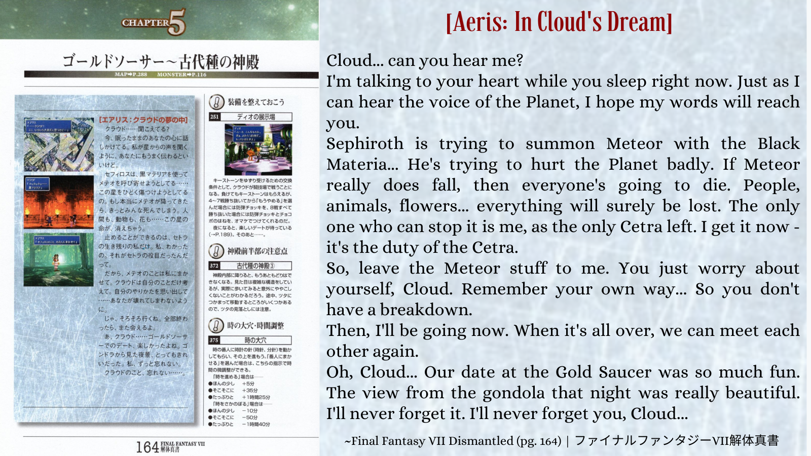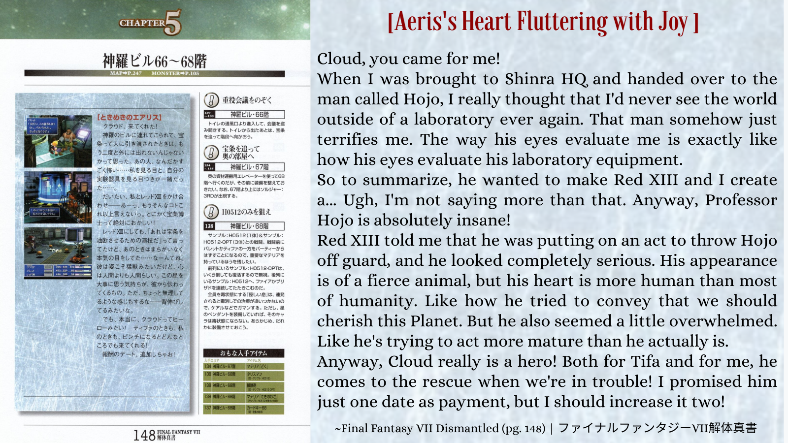 Chapter 5 of Dismantled is its “Story” section, and while going through tips and tricks, it includes diary entries from the various cast members. Cloud’s feelings for Aeris are as clear as it gets, with Dismantled looks at the story through the Clerith lens. Check out the relevant entries below!