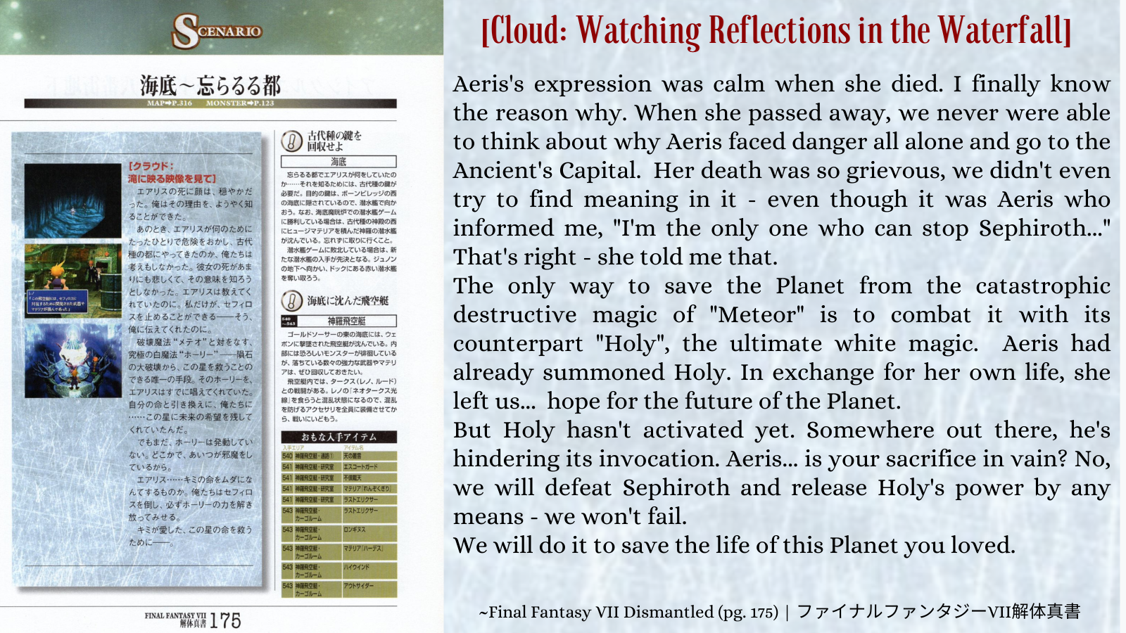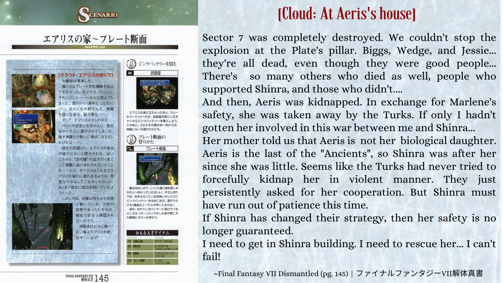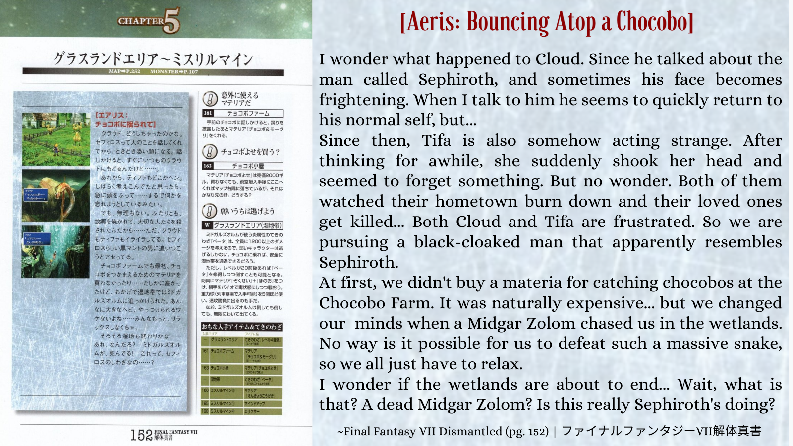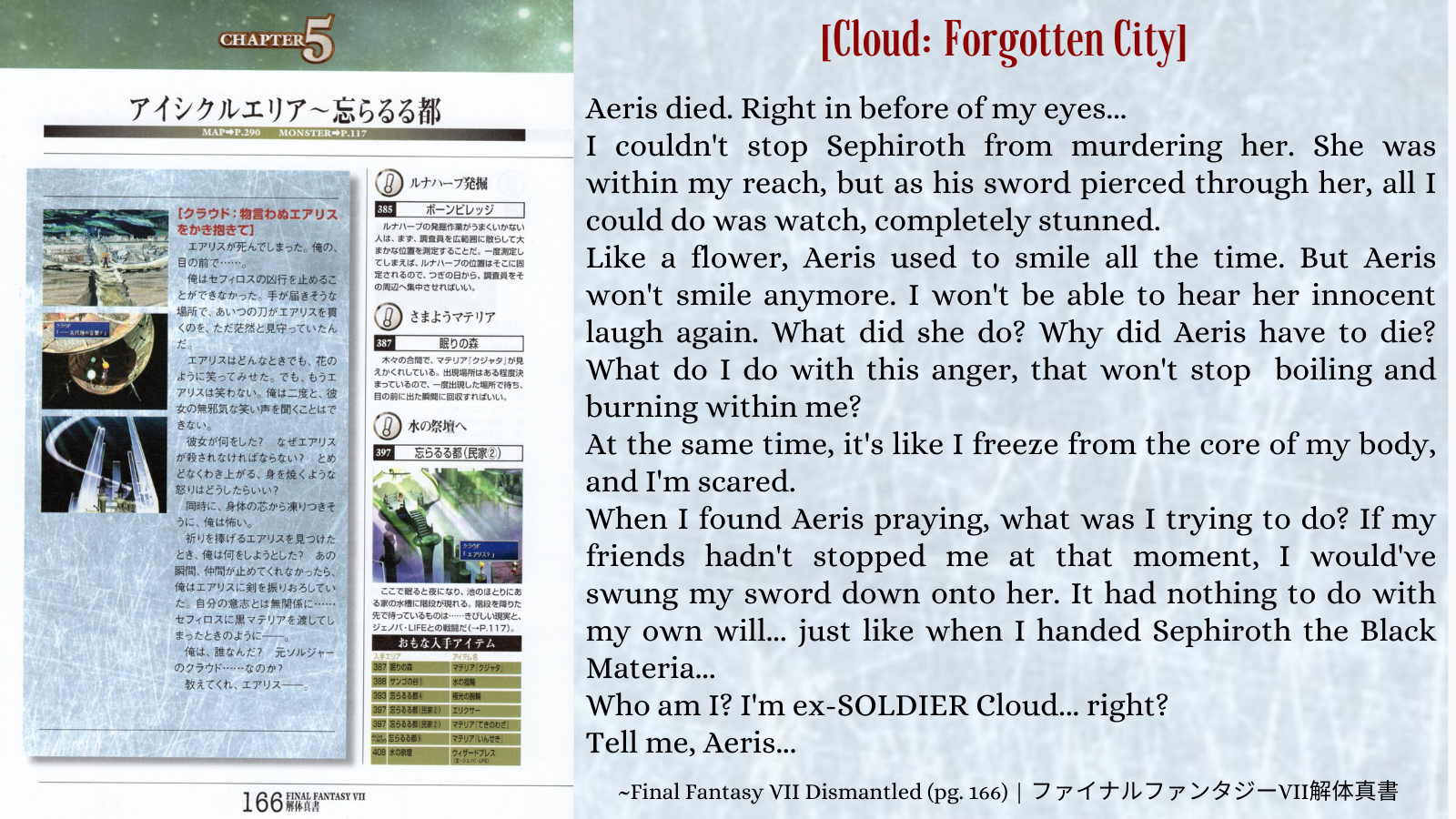 Chapter 5 of Dismantled is its “Story” section, and while going through tips and tricks, it includes diary entries from the various cast members. Cloud’s feelings for Aeris are as clear as it gets, with Dismantled looks at the story through the Clerith lens. Check out the relevant entries below!