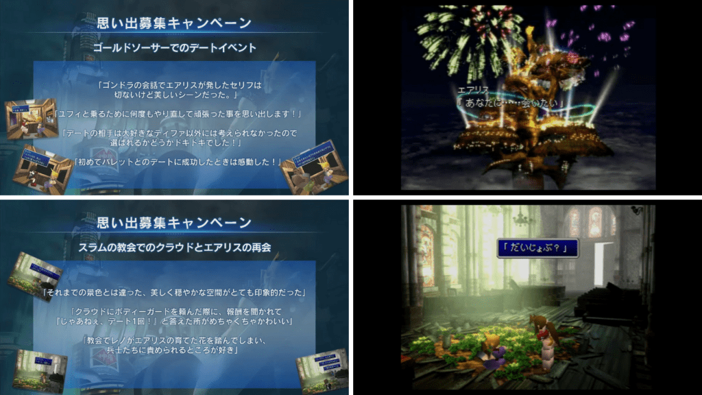 As part of a nostalgic segment about sharing memories from special moments in the game, two scenes were selected to be played during the production’s “reminiscence” portion. The first was riding the gondola with Aeris in Gold Saucer during Cloud’s date with her, and the second was Cloud’s reunion with Aeris in the church. Both scenes were played fully on the stream.
