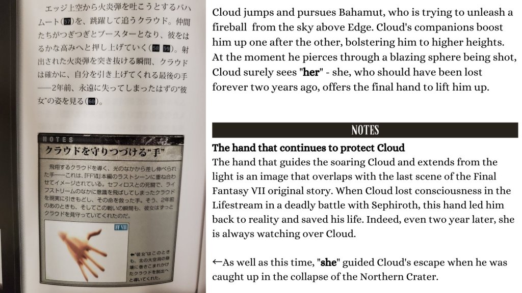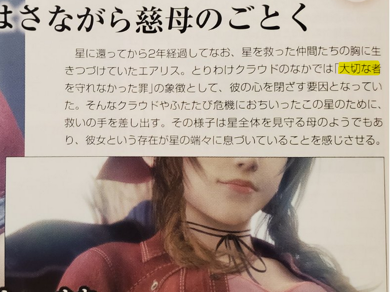 Let’s look back at the interview on the meaning of Hollow, where Cloud is interpreted by Nojima as as someone who has lost “something important.” The phrase here in Japanese is 大切なもの (taisetsu na mono) – which can mean a precious or cherished thing or person. A person-only variation, 大切な人 (taisetsu na hito) means “special someone” or even “significant other.” These phrases are regularly used to describe Cloud’s relationship to Aeris.