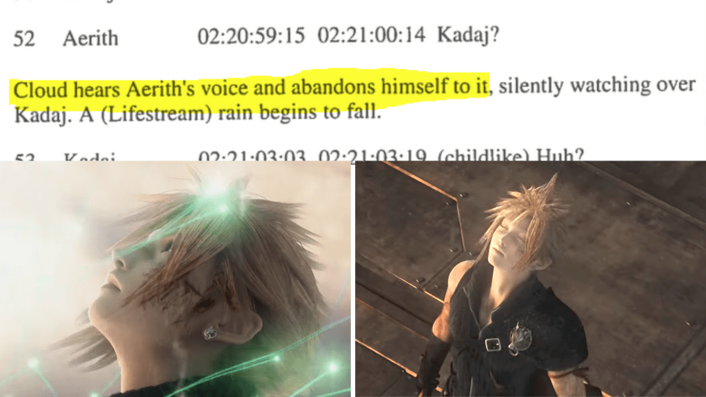 Nomura provided a few keywords and phrases to build upon for Hollow, which included a description of Cloud standing in the rain in a barren place. A memorable scene in Advent Children is Cloud, upon defeating Kadaj, standing in a Lifestream rain and sensing Aeris’s presence. (At this moment, The Promised Land begins to play – the song that is used in Remake to set up Cloud’s first meeting with Aeris, but was not in the original game itself.)