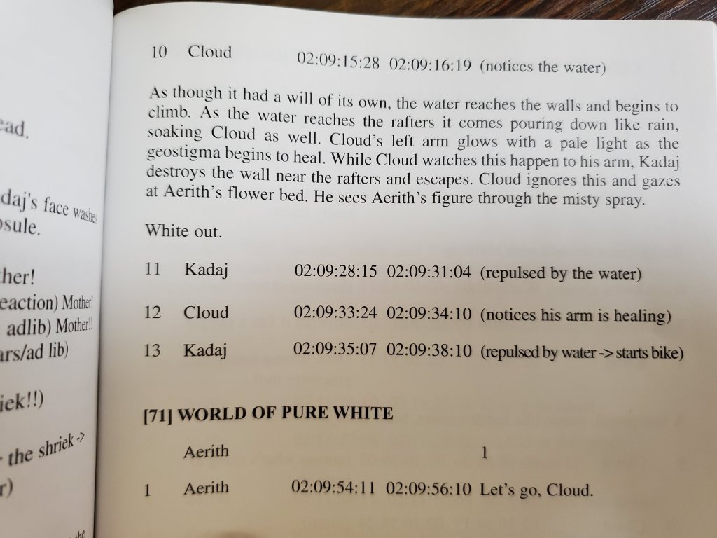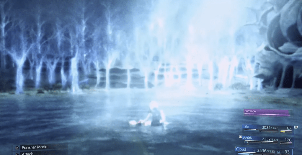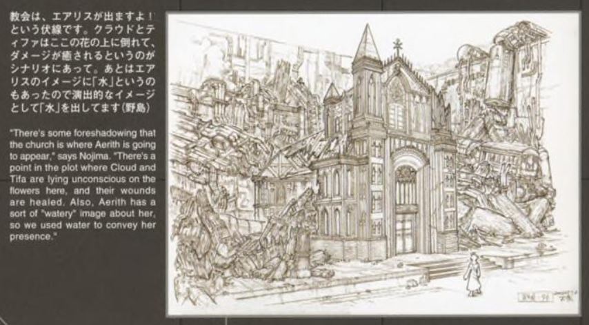 […] Also, Aerith has a sort of ‘watery’ image about her, so we used water to convey her presence.