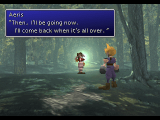 This exchange, which also appears to Cloud in what seems to be a dream, alludes to Aeris’s own death and offers important context to Aeris’s motives in trying to dissuade Cloud from falling in love with her.
