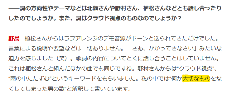 - Nojima interpreted that as “a ballad for a man who lost something important to him” (Nojima uses the word 大切なもの as “something important – we’ll get to that)
