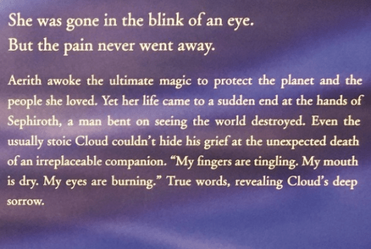 Aerith: I’m glad I met you, Cloud. I really am. I’m grateful for all the words we’ve shared. For all the moments and the memories. You’ve made me more happy than you know. And I’ll always cherish what you’ve given me. But… But whatever happens, you can’t fall in love with me. Even if you think you have…it’s not real.