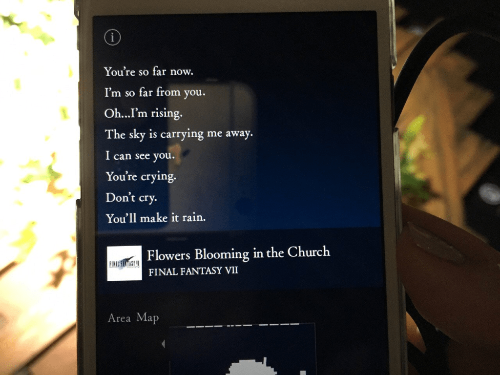 The event also included a recreation of Aeris’s flowerbed and church in the Sector 5 slums with an audio performance of “Words Left Behind by Aerith,” a monologue penned by Nojima. This monologue was the first instance of the mascot character Stamp being referenced, which means it incorporated new lore into its composition. Likewise, Hollow may have been written or even recorded by this time. Nojima, after all, wrote the lyrics both to Aeris’s monologue and to Hollow.