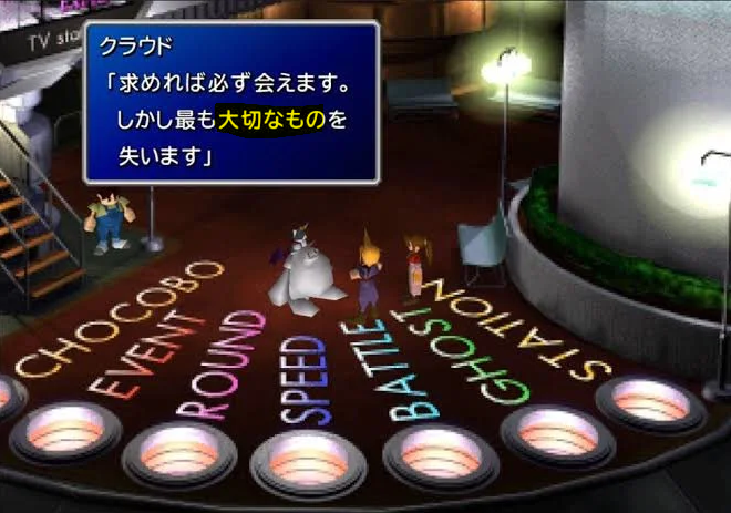 First, in the original game, Cait Sith delivers a fortune to Cloud, which reads “you will find what you’re looking for, but you will lose (your taisetsu na mono).” In this case, of course, the phrase refers to Aeris, who will die.