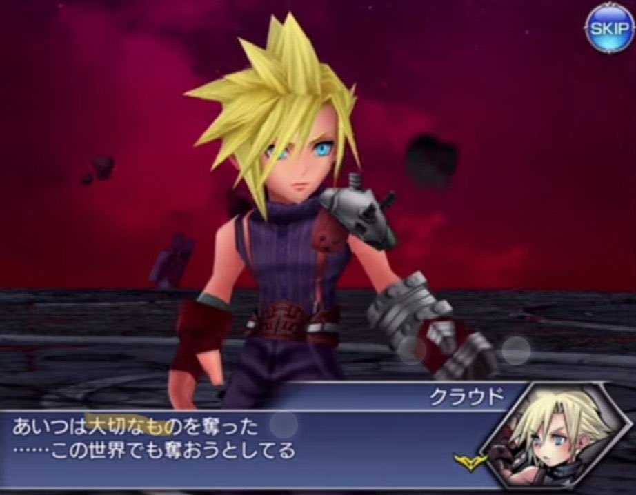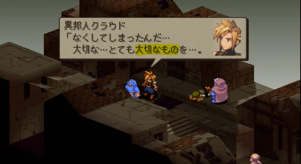 The examples of this throughout the Compilation and supporting materials are numerous. To list only a handful for brevity’s sake, Ultimania guidebooks describe Aeris as Cloud’s 大切な人. In World of Final Fantasy, 大切な人 is also used. 大切なもの is used, for example, in Record Keeper and Dissidia Final Fantasy. In Final Fantasy Tactics, Cloud warps to Ivalice and meets an alternate universe version of Aeris, and mourns that he lost a 大切なもの.