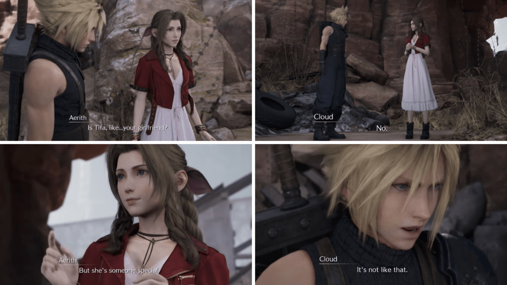 Likewise, when Tifa asks about the nature of Cloud and Aerith’s relationship at the beginning of Chapter 10, Cloud doesn’t elaborate or rush to deny.