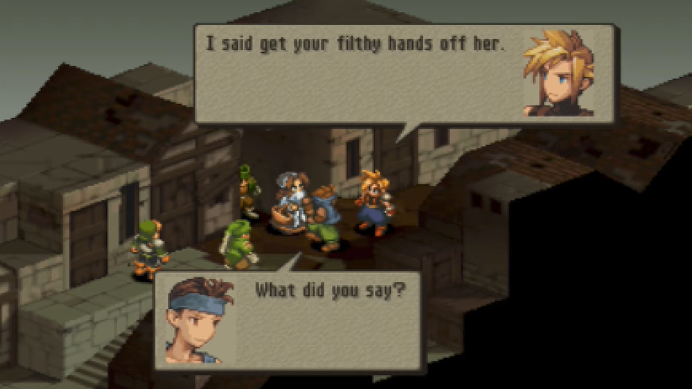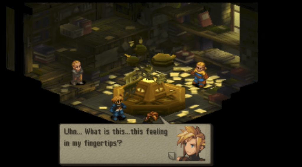 Cloud’s line about his fingers tingling and his eyes burning is a direct reference to his lines of shock directly after Sephiroth murders Aeris. He is feeling real physical pain from grief in his jumbled memories. This will contextualize the thesis of Cloud’s storyline in Tactics and his upcoming meeting with Aeris. (Of course, “…phiros” was mistransliterated, it should be “…phiroth”, as in, “Sephiroth.”)