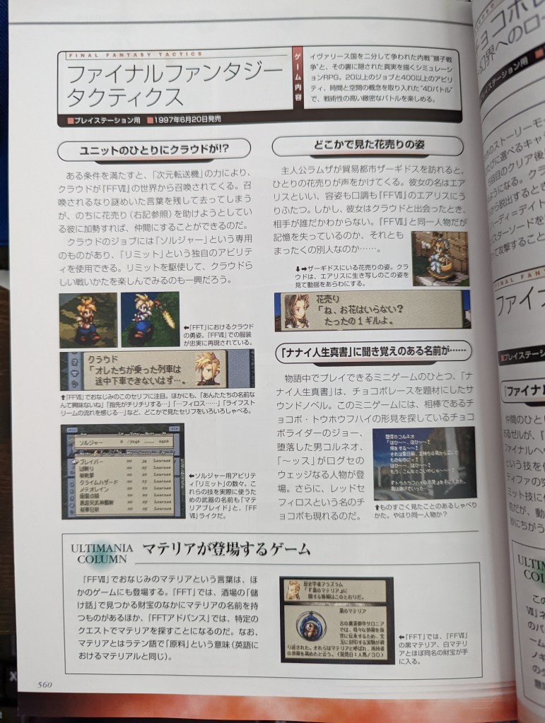 Final Fantasy Tactics was acknowledged in the Final Fantasy Ultimania Omega, with page 560 dedicated to the game. The page describes Cloud’s appearance as a recruitable character, and Aeris’s presence as a woman who bears a striking resemblance to the Aeris of Final Fantasy VII but without any memory of Cloud. Check out the page here: