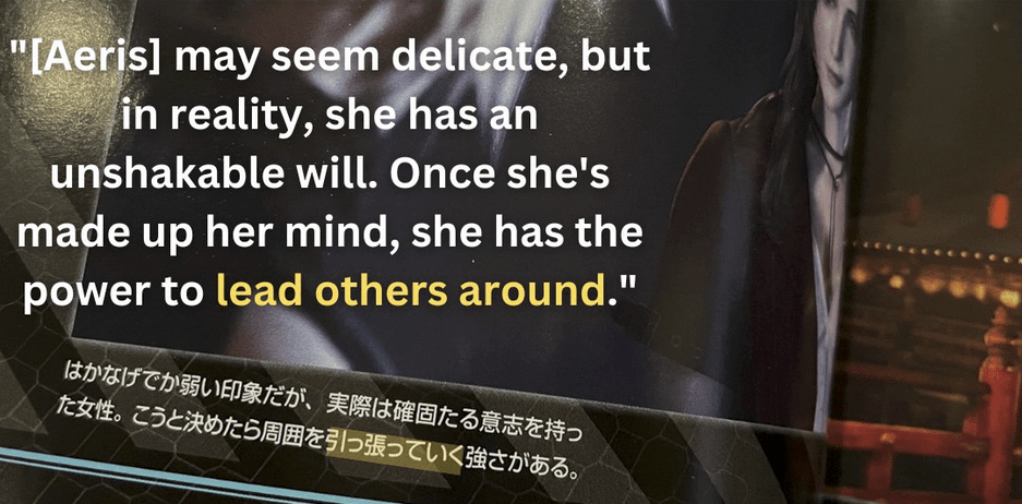 This phrase cannot describe the reserved and cautious Tifa at all. And though the game is already not exactly subtle, this phrase, グイグイ引っ張っていく (“[someone] who pulls/leaders [you] around without hesitation”) is used to describe Aeris a number of times in her official profiles.