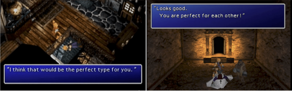 Claudia describes an Aeris-type girl as “perfect” (or, in Japanese, ピッタリ). Cait Sith later predicts the compatibility between Cloud and Aeris, and comes to the same conclusion – they are “perfect” (ピッタリ) for one another. The word choice is identical in Japanese and English.