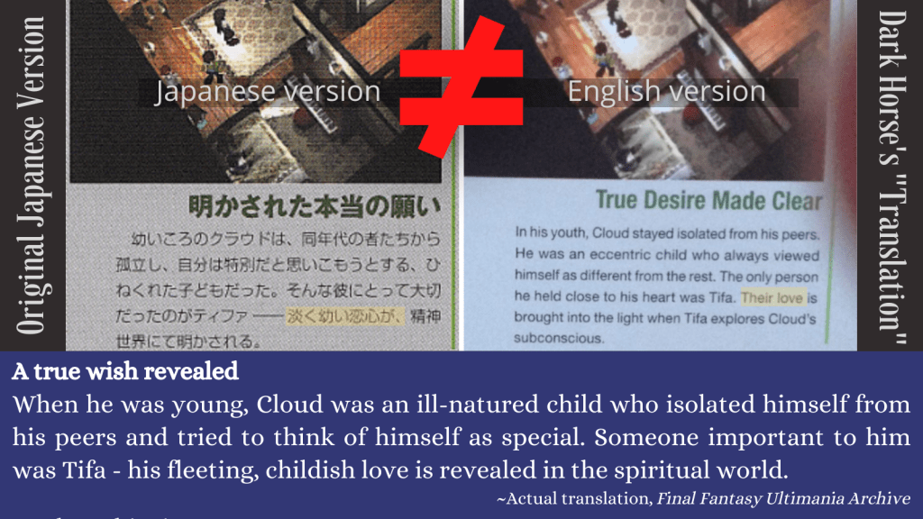 As you an see, Dark Horse actually invented some of the language and it distorts the original meaning. The Japanese says nothing about Tifa being the “only one close to his heart”. It only says she was important to him. The love revealed in the Lifestream in Japanese is called “fleeting” and “childish/young” – and only describes fourteen-year-old Cloud’s feelings, not present-day Cloud’s. Dark Horse inserted the word “their” – implying Cloud and Tifa’s present-day love was revealed.