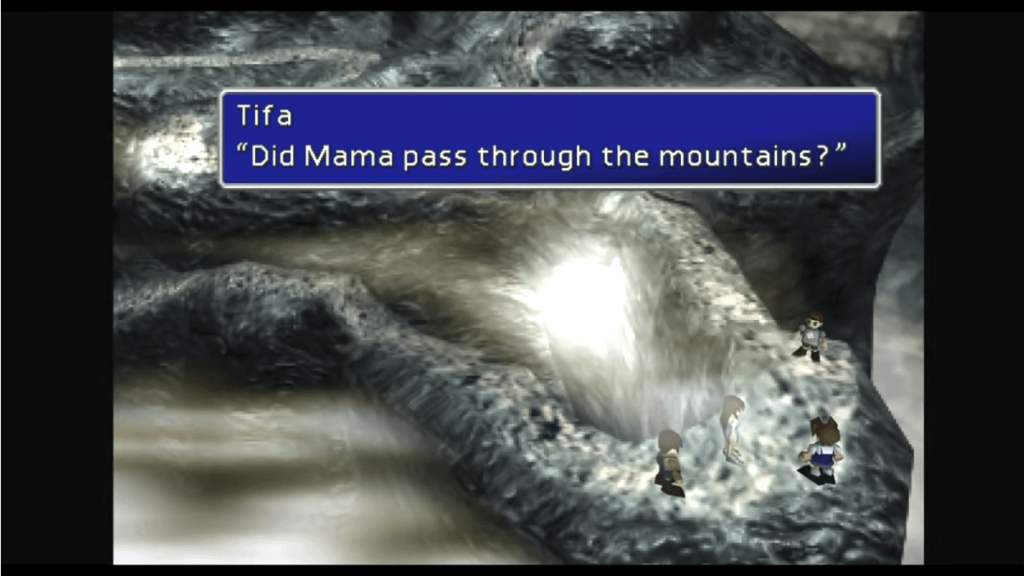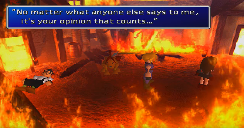 By centering Tifa in this memory, Cloud isn’t revealing Tifa being his “one true love interest.” He is identifying the Mt. Nibel incident as the impetus for his identity complex: his desperate desire to become strong in order to rewrite the narrative of his shameful failure, and finally be noticed and therefore accepted.