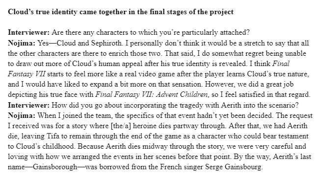 Weekly Famitsu No. 1224, interview with Kazushige Nojima, translation by TurquoiseHammer