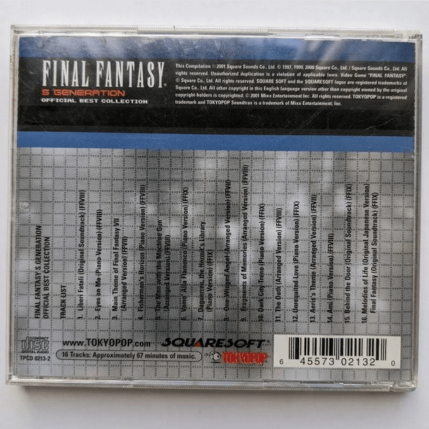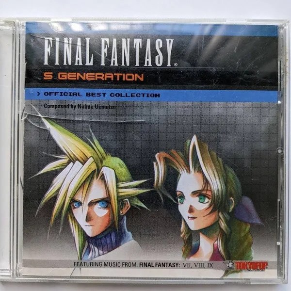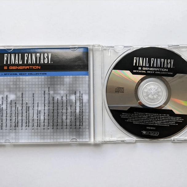 2001 album Final Fantasy S Generation (PlayStation 1 era) Official Best Collection soundtrack featured remixed and orchestrated arrangements of Final Fantasy VII, VIII, and IX musical pieces authorized by Nobuo Uematsu himself. It is licensed by Squaresoft (as is visible in the trademark on the case), who teamed up with Tokyopop for soundtrack distributions prior to the Square Enix merger, at which point they made their own label. The “S” in “S Generation” stands for “Sony” (as in, Sony PlayStation).