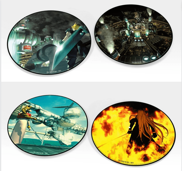 Check out these vinyl discs, which were originally released in 2013 as a limited edition set! They feature the holy trinity of Final Fantasy VII: Cloud, Aeris, and Sephiroth. (This matches certain versions of the original PlayStation game, which also featured these three on the discs.)