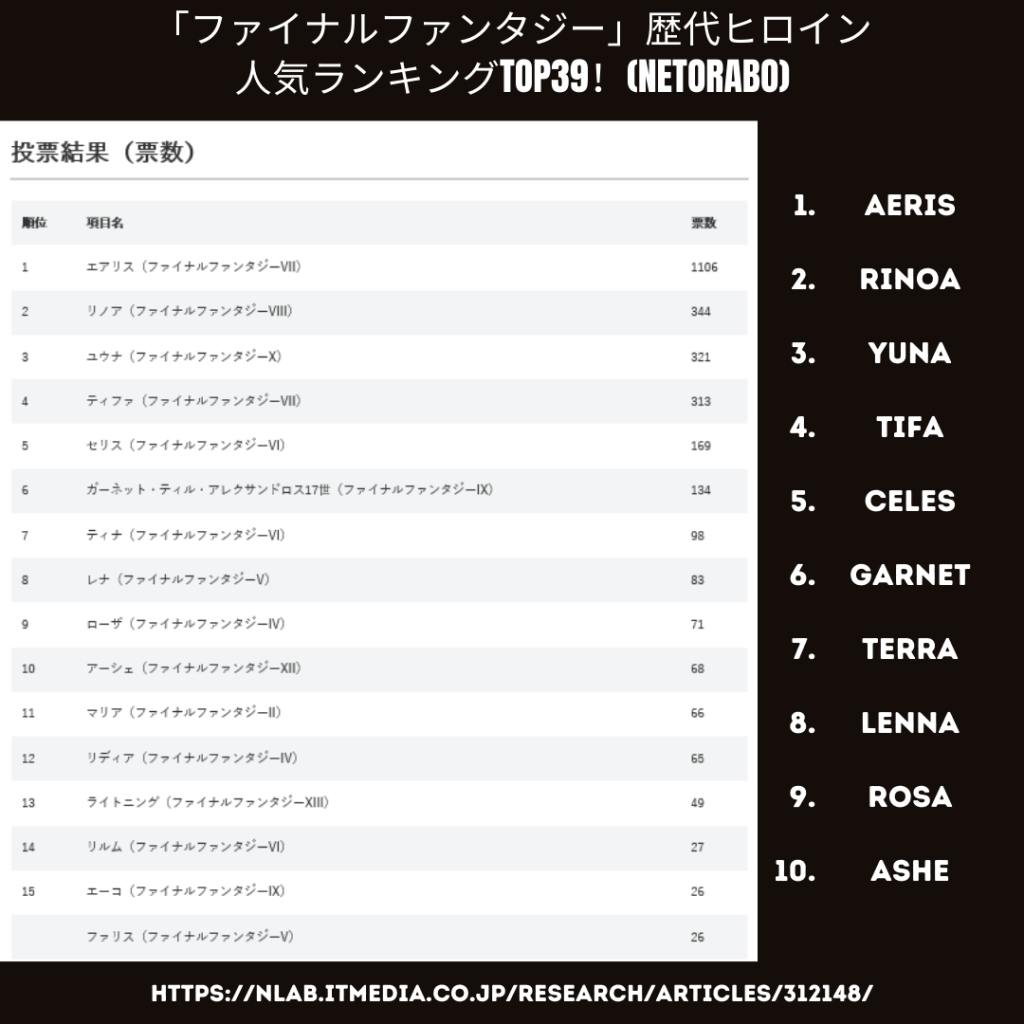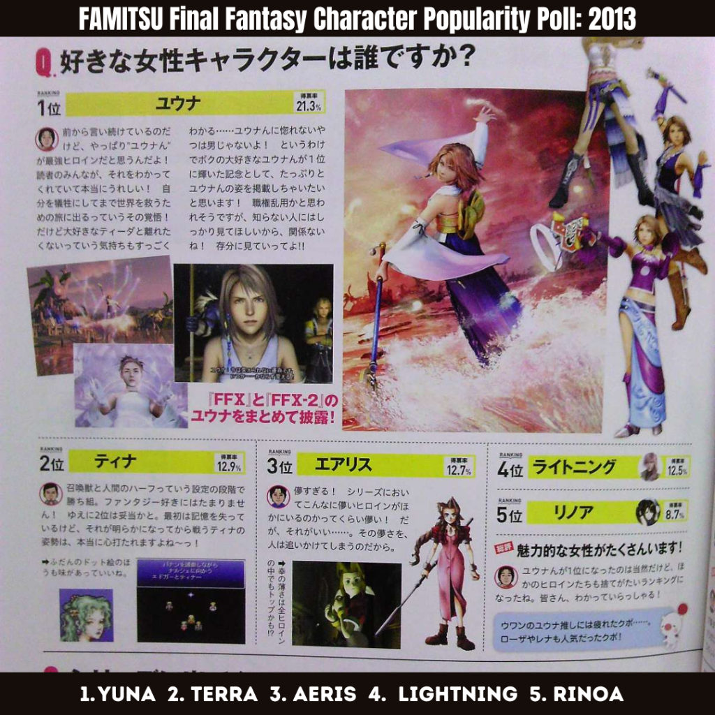 Meanwhile, in 2013, Famitsu also conducted a popularity poll for the top Final Fantasy heroines!