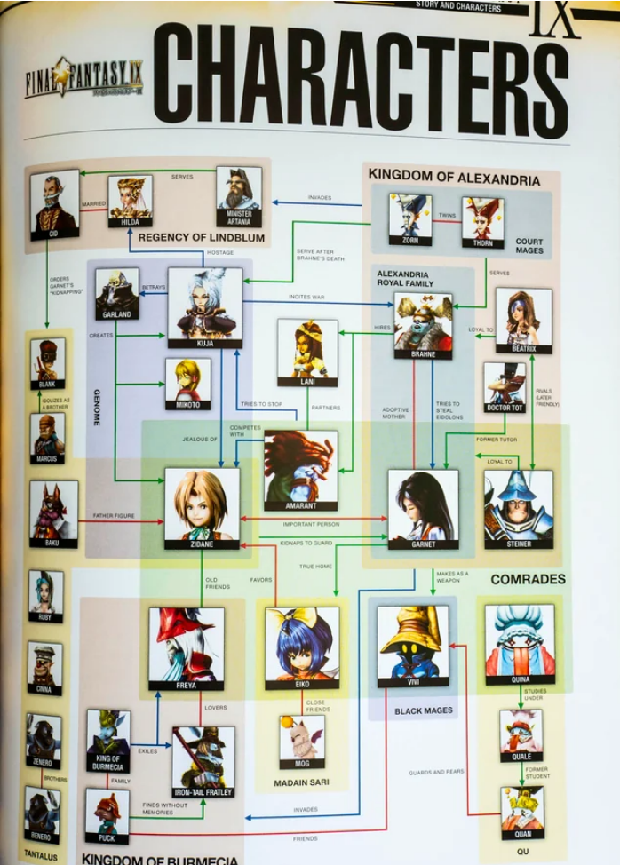 If you’re still not convinced, let’s check out the relationship charts for Final Fantasy VII, VIII, and IX – which are contained in this same book. I’ll use Dark Horse’s English here, since it’s hard even for them to mess this up.