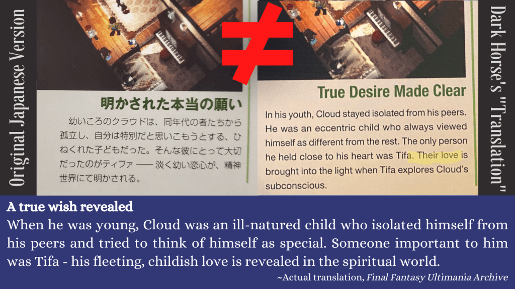 Our Dark Horse translator must not have liked that the text says Tifa invited Cloud out on a date, and so swapped who did the asking. Despite this blatantly not being what the Japanese says, nor what even happens at the Gold Saucer in Final Fantasy VII, the “translator” decided to put that Cloud was the one who asked Tifa, not vice versa, falsely suggesting Cloud took romantic initiative with her.