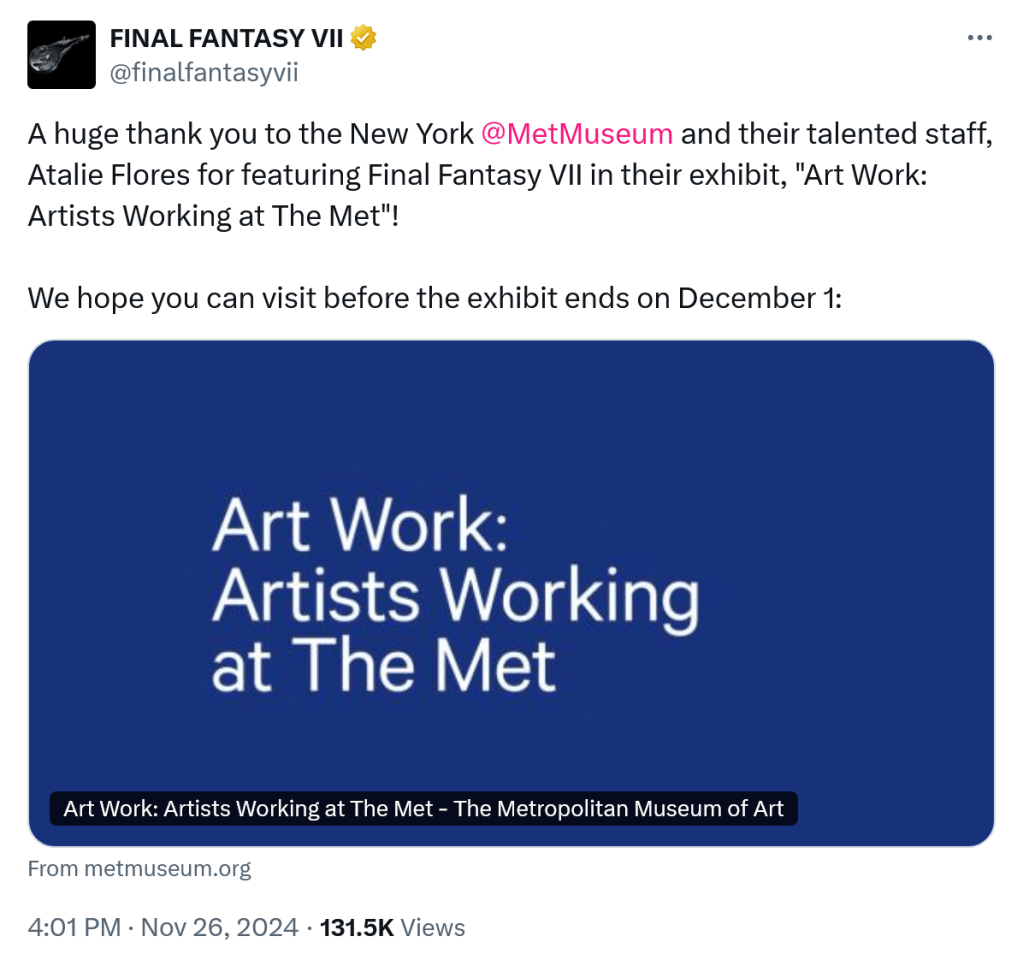 A huge thank you to the New York @MetMuseum and their talented staff, Atalie Flores for featuring Final Fantasy VII in their exhibit, “Art Work: Artists Working at The Met”! We hope you can visit before the exhibit ends on December 1: https://pbs.twimg.com/card_img/1861515530756374528/LhF6usCR?format=jpg&name=small