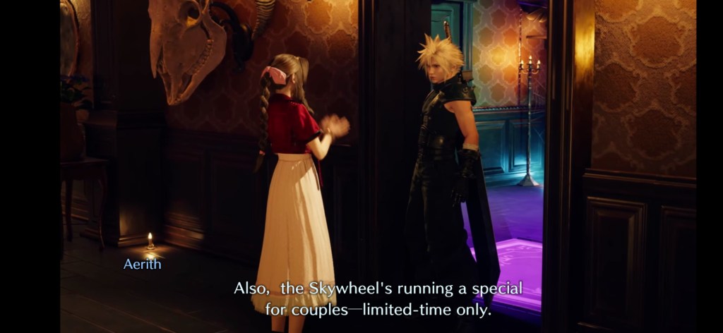 Titled “FFVII Rebirth: LOVELESS Behind the Scenes,” the event opens with Aerith knocking on Cloud’s door and inviting him to see Loveless with her. The video footage comes straight from Rebirth, and it isn’t abbreviated at all – it includes Aerith mentioning the Skywheel couples’ night special, and teasing Cloud for getting flustered as well.