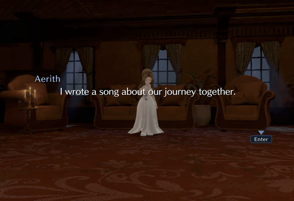 At the end of a series of battles, Cloud comes in to check on the group. As they leave to take their places on stage, Aerith says she wrote a song about their journey together. Of course, this references her song No Promises to Keep. The music that plays in the background is the same music that plays during her gondola date with Cloud, suggesting a special connection between her words and her feelings for him.