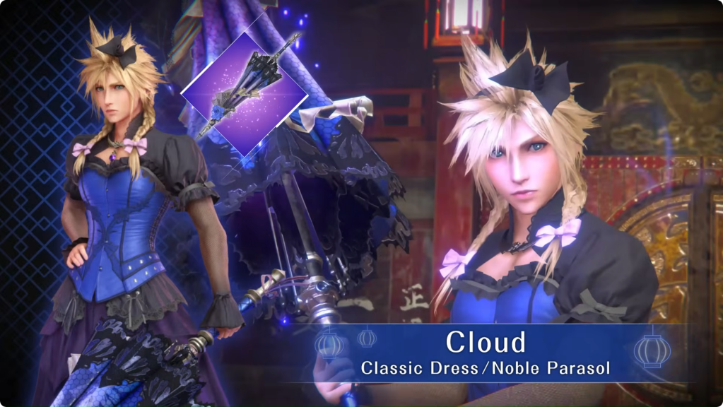 Cloud himself also gets to participate in the event, and is finally featured in a dress of his own. Titled the “Classic Dress,” he wears his blue and black corset dress, and wields a “Noble Parasol.”